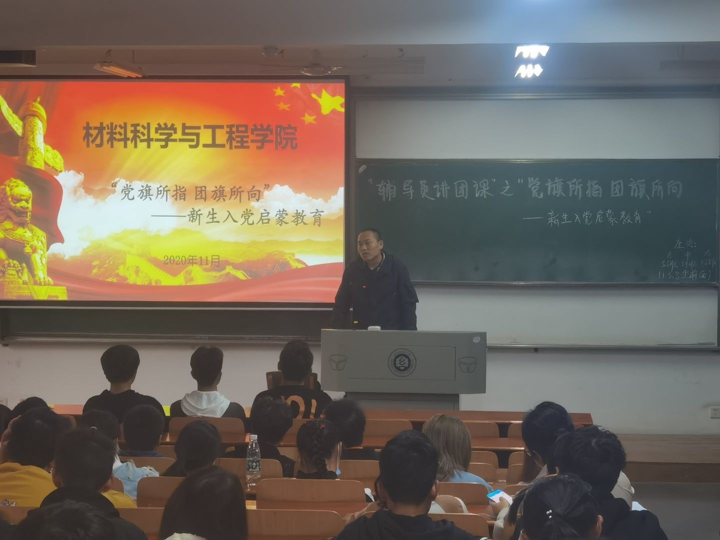 为认真落实习近平总书记提出的“要在坚定理想信念上下功夫,教育引导学生树立共产主义远大理想和中国特色社会主义共同理想”的讲话精神,帮助2020级新生更好地了解党的基本知识、熟知入党条件和流程,williamhill于11月5日下午在3号教学楼开展了一堂题为“党旗所指 团旗所向”的团课,对新生进行入党启蒙教育。团课由第二学生党支部书记、学院辅导员毛成兴主讲,所有2020级新生参加了团课学习。