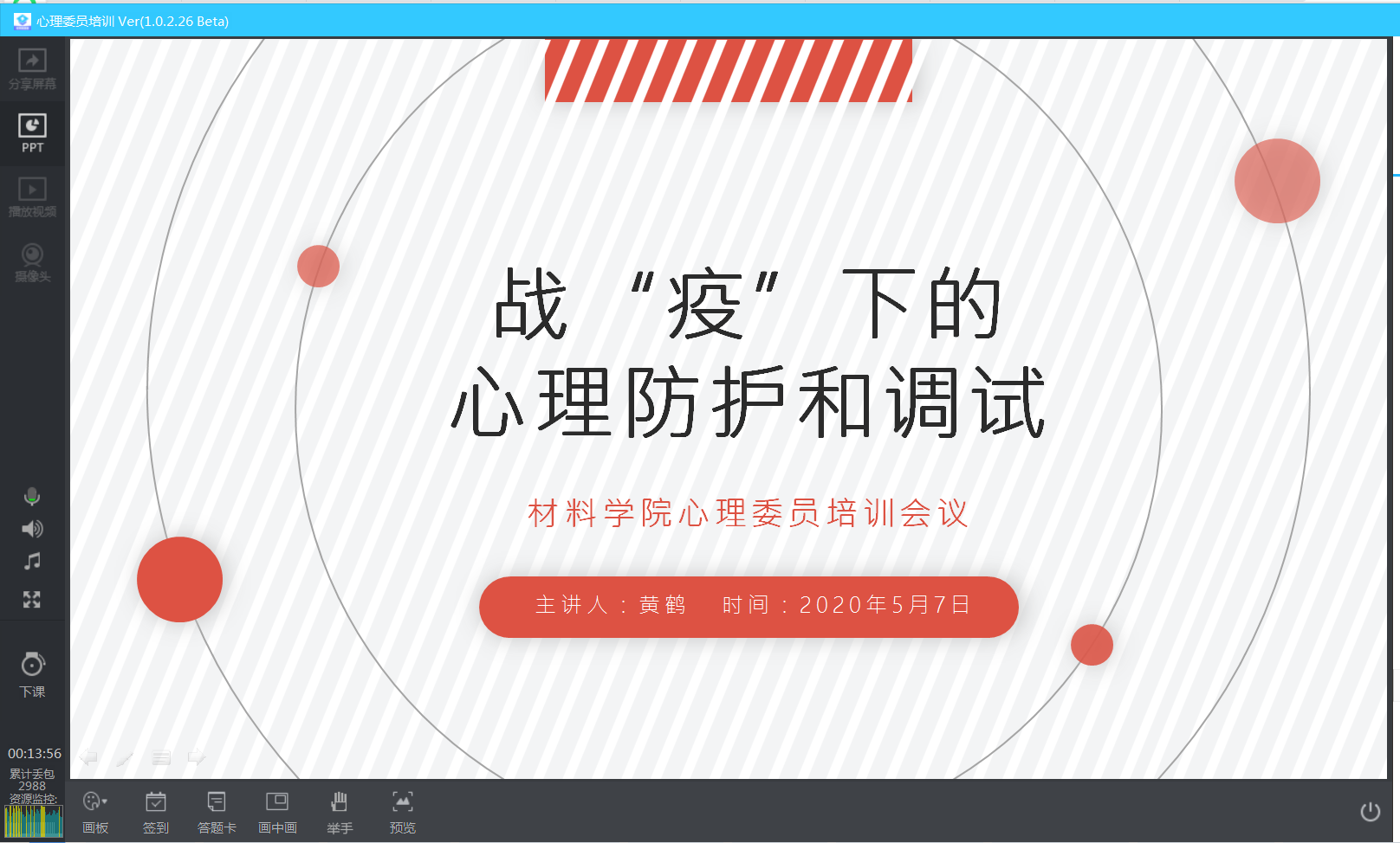 培训会主讲人黄鹤老师从当好班级同学心理恢复的“陪伴者”,当好班级同学身心健康的“守护者”,当好疫情防控的“践行者”等三个方面依次展开了阐述。