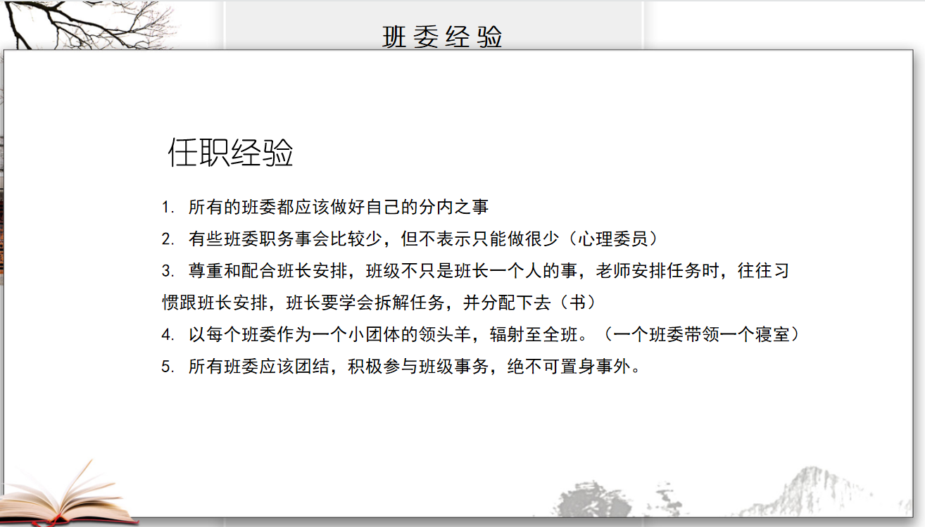 李翠,高分子11801班班长,带领班级获得先进班级体、十佳班团二等奖、五四红旗团支部等荣誉,班级同学累计发表论文、专业近十项,今年班级考研率居年级第一名,从班长的角度分享如何发挥作用、如何增强班级凝聚力,详细介绍了班风、学风建设的经验,提出每一位都是班级管理的参与者,要共同为班级建设做贡献。