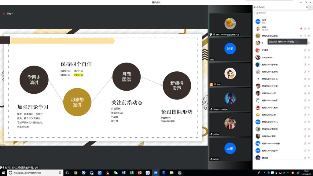 “青春力量 感动纺大”候选人、材科12002班的邱俚涵同学,分享了自己在学习习近平新时代中国特色社会主义思想方面的感悟和参加宣讲比赛的经历,用理想指导实践,他还积极探索乡村发展的路径。在谈及自己在科研方面取得的成绩时,他比较详细地分享了自己的科研历程,为同学们积极加入实验室提供了参考。