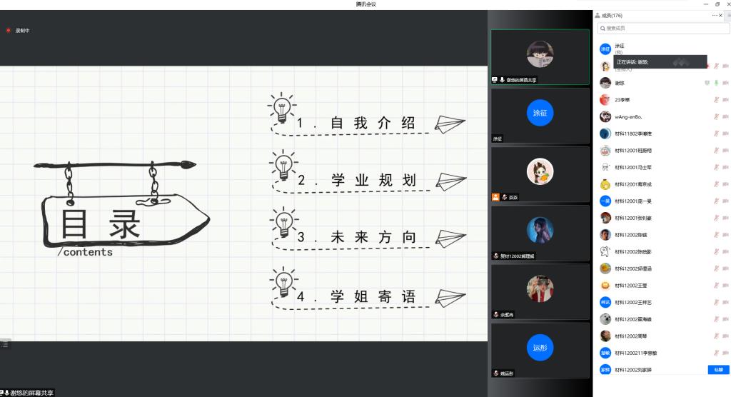为更好地帮助学生规划好自己的学习生活,营造良好的学习氛围,4月22日晚,williamhill2020级学业规划分享会暨朋辈领航报告会在线上举行。本次会议邀请了毕业生代表姜鑫、李博惟、李艳丽、谢悠、朱亮、李翠,以及非毕业班代表、学校十大榜样人物候选人刘昊冉、邱俚涵等8名学生代表,分别分享了自己的学习和考研、科研和双创、社会实践和志愿服务等。学院辅导员老师毛成兴及全体2020级学生参加了本次会议。
