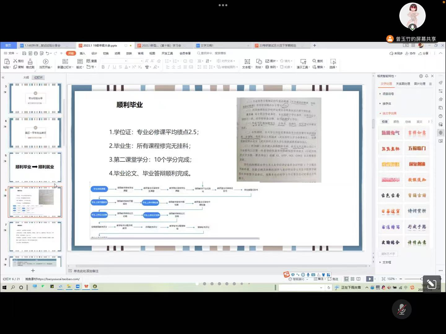 首先,曾老师从顺利毕业与顺利就业两个方面入手,详细讲解了毕业条件及大四下学期的考研、求职及毕业安排,特别介绍了西部计划、三支一扶、大学生村官、征兵入伍等基层就业计划,提醒同学们对照自身情况尽早行动。随后,又分别介绍了2-6月的毕业工作要点,帮助同学们系统梳理了下学期毕业工作安排,让同学们做到心中有数,并就同学们关注的毕业答辩、校园管理、春季招聘等事宜进行逐项解答。最后,曾老师给同学们几点建议:一是心态稳定、提前规划、及时行动;二是加强体育锻炼,提高身体素质;三是杜绝等、靠、要的思想,积极寻求解决办法;四是充分考虑时间成本、经济成本、试错成本,为自己即将到来的毕业提前谋划、做足准备。