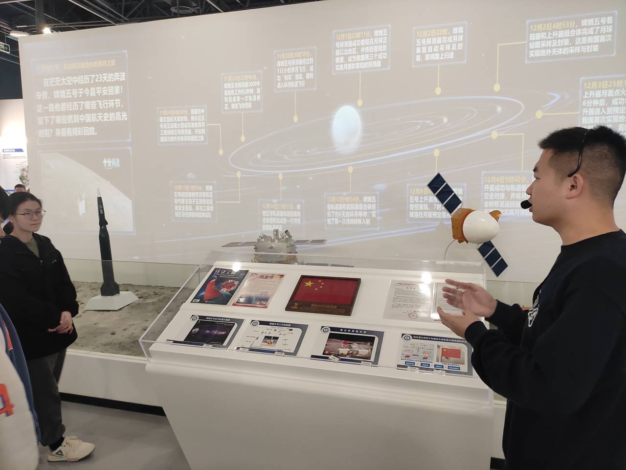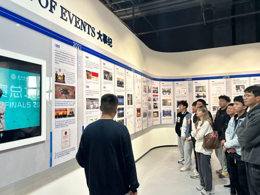 纺织科技馆讲解员通过丰富的图文及实物,为学生介绍了纺织科技进步历程,从纺织缘、传统纺织、现代纺织、大纺织、超纺织、未来纺织六个板块展现了纺织的历史、文化与科技进步。参观学生在徐卫林院士团队研发的月面国旗前驻足观看,对我校发展取得的优异成绩和众多科技成果赞叹不已,不时拿出手机拍照。