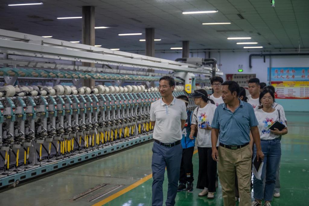 在王罗新院长的带领下,实践团一行前往新疆知名纺织企业——新疆金鑫昱纺织有限责任公司,与援疆企业家李斌总经理进行深入交流。“新疆为什么好”“新疆纺织企业为什么好”“大学生为什么要来新疆”“青年一代如何援疆”,作为产业援疆的企业家代表,李总向实践团成员深情讲述自己在新疆拼搏的四年,将新疆的变化、企业的发展以及自己对新疆深厚的感情娓娓道来,让实践团成员深受鼓舞。他鼓励广大青年学生能够了解新疆、走进新疆,在这片美丽的土地上扎根奋斗、奋勇直前。随后,在企业工作人员带领下,实践团参观了纺织企业生产一线,进一步了解纺织生产原理和加工技术。