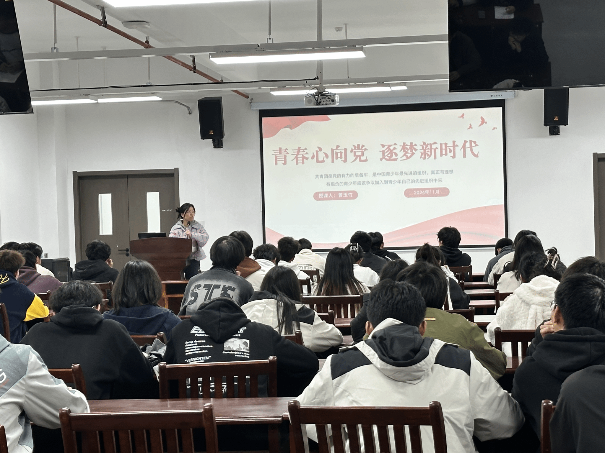 在团课上,曾玉竹以“为什么要加入中国共青团”作为引入,引导同学们学习中国共产主义青年团的发展历史,并从端正入团动机、团务基础知识、入团流程、团员权利与义务等方面进行详细讲解,帮助同学们更加全面深刻地理解共青团地相关知识。曾玉竹鼓励入团积极分子将理论学习与实践活动紧密结合,认真学习、刻苦钻研,从日常地细微点滴做起,不负青春韶华、勇担时代使命,为实现中华民族伟大复兴的中国梦贡献青春力量。