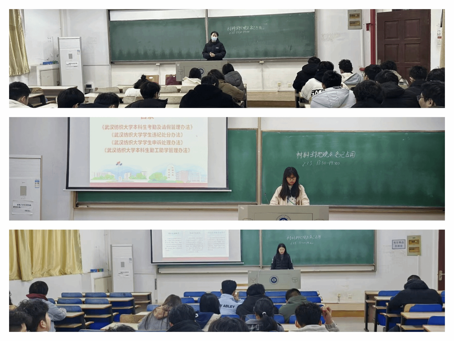 班会伊始,全体辅导员和班主任对所带年级进行人数清点,认真核查学生报到情况,落实和上报未报到学生的名单及事由。对于未到的学生,班主任和辅导员们逐一进行联系,确保掌握每一位学生的动态。同时,严格按照学工部下发的晚点名要求,组织开展“学习校纪校规,做文明大学生”主题班会。随后,辅导员讲解了校纪校规的重要性,并详细介绍了我校考勤、请假、违纪处分、申诉等多方面的处理办法。所谓没有规矩,不成方圆,校规校纪犹如“一把尺”,维护着校园秩序,促进学风的建设,培养学生的法治意识。校纪校规是学校教育教学工作顺利开展的重要保障,也是培养学生良好品德和行为习惯的重要依据。希望同学们将校规内化于心、外化于行,以实际行动做文明大学生,共同为创建文明校园贡献力量。