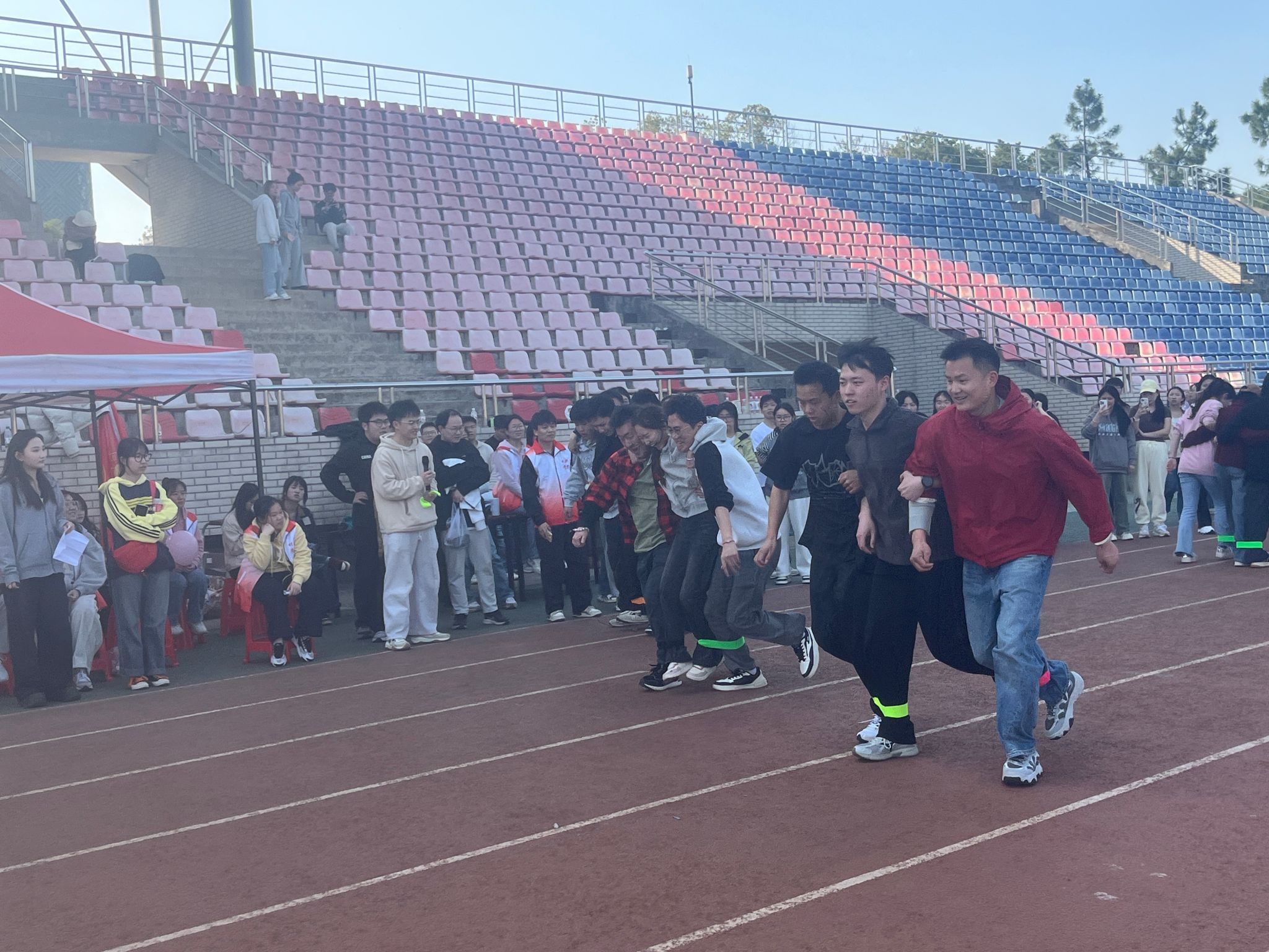 “背身夹球”考验着同学们的团队协作能力。两人一组,背靠背夹住篮球,小心翼翼地向终点迈进。过程中,他们相互配合,步伐一致,生怕球掉落。一旦球落地,他们便迅速调整姿势,重新出发。这个项目不仅锻炼了同学们的身体协调性,更增强了彼此之间的信任与默契。“两人三足接力”将团队合作展现得淋漓尽致。同学们两两一组,将腿绑在一起,齐心协力向前奔跑。他们相互扶持,步伐一致,仿佛是一个整体。在交接棒的过程中,大家默契十足,无缝衔接。观众们的加油声更是此起彼伏,整个赛场变成了欢乐的海洋。