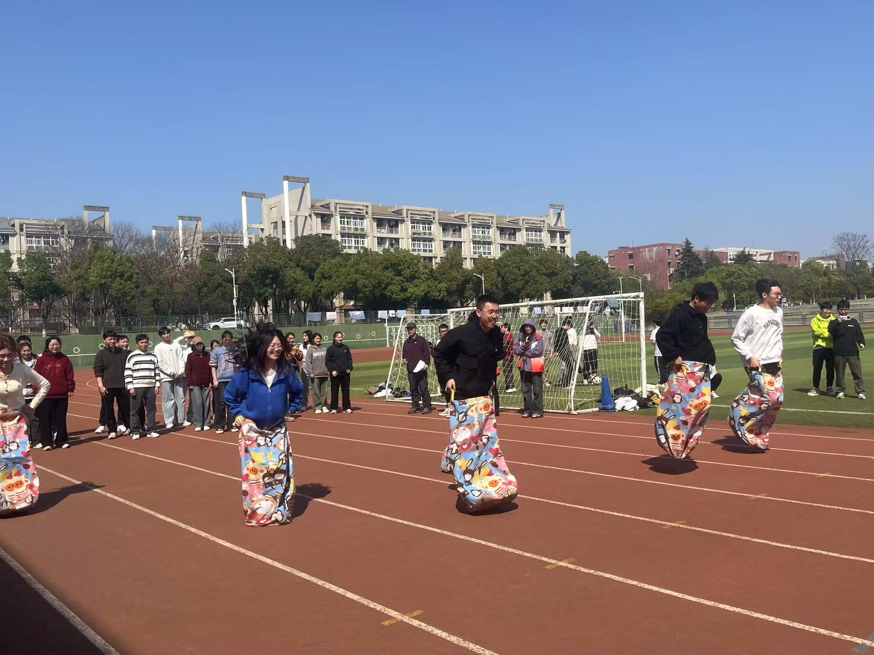 “袋鼠跳跳”更是将现场气氛推向高潮。参赛者们双脚并拢,双手紧紧抓住袋子,像袋鼠一样在赛道上跳跃。他们的脸上洋溢着自信的笑容,尽管跳跃过程中有些许踉跄,但大家毫不在意,尽情享受着运动带来的快乐。旁边的观众们也热情高涨,为选手们加油助威,呐喊声此起彼伏。