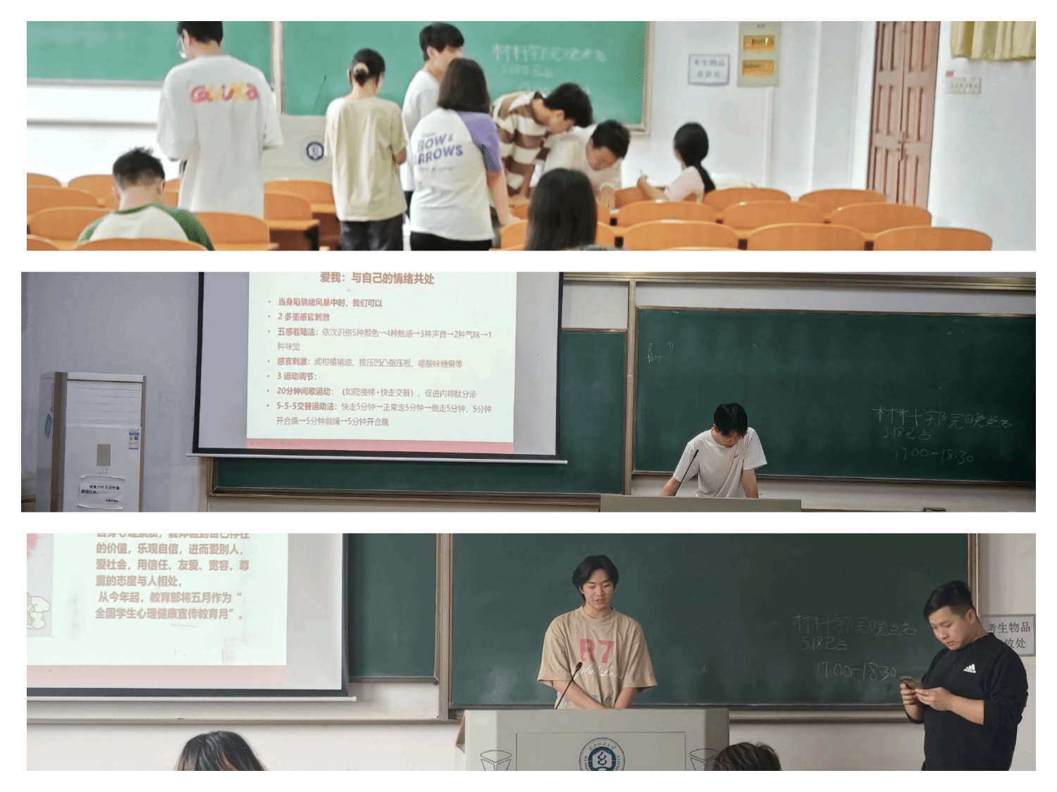 班会聚焦“爱我”,深度讲解自我接纳,剖析自我接纳原因,引导学生正视优缺点,传授全面看自己、换视角看“短板”等实用方法。在情绪管理上,多维度介绍调节策略,从生理调节(478呼吸法等)、感官刺激(五感着陆法等)到运动调节(间歇运动等),还提及情绪外化与认知重评技术(写情绪日记等)。此外,班会为同学们提供了心理求助途径,公布阳光校区、南湖校区的预约电话和咨询地点 ,并预告5月“我爱我”系列活动,如“5·25‘笑览美好,青春有行’”“‘我爱我’心理测评”等,涵盖文化展示、心理测评、知识竞赛等丰富内容。