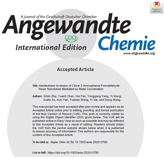 2月21日,化学领域国际顶级期刊《德国应用化学》(AngewandteChemie International Edition,影响因子12.959)在线接收我院教师陈媛丽在聚合物手性可控合成方面取得的重要进展—“Handedness Inversion of Chiral 3-Aminophenol Formaldehyde Resin Nanotubes Mediated by Metal Coordination”。该论文的第一通讯单位为williamhill中国,通讯作者为王栋教授与陈媛丽博士,这是我校首次以第一单位在《德国应用化学》上发表学术论文。