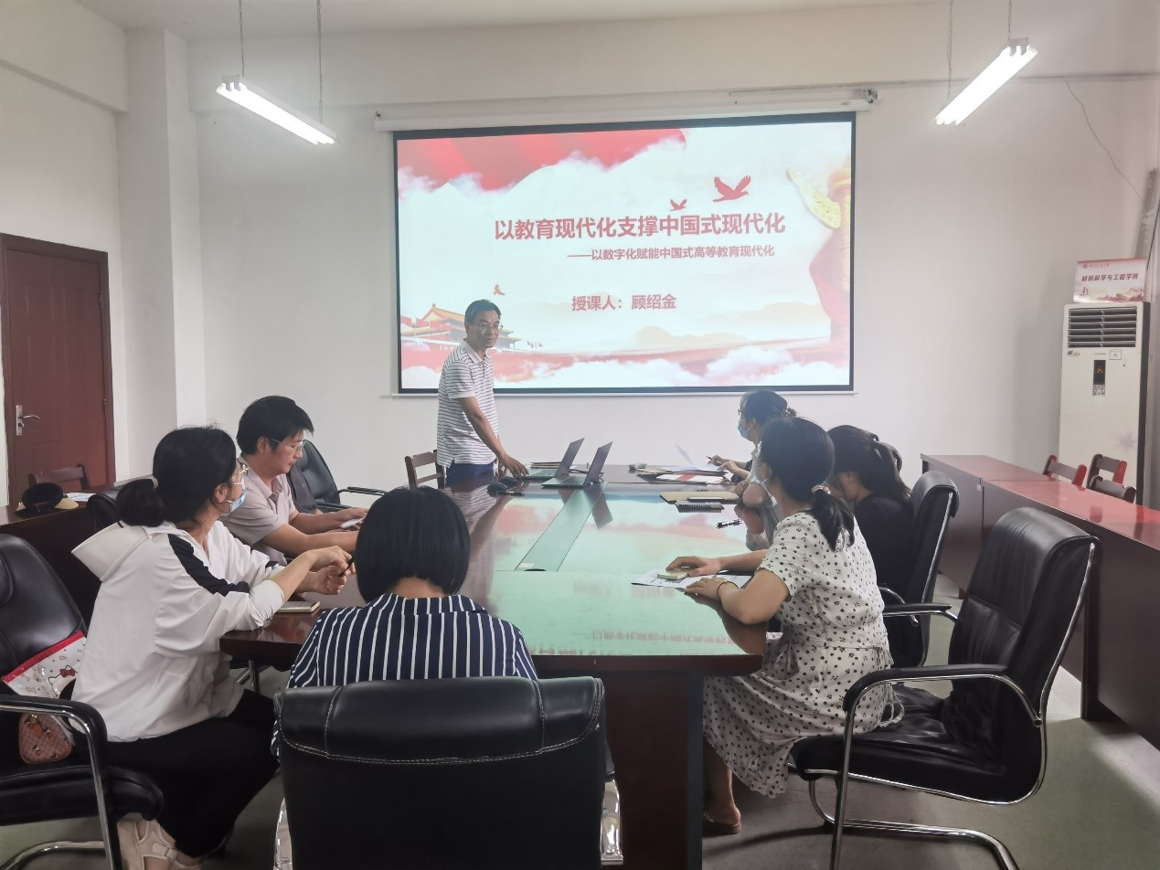 2023年6月15日下午,williamhill材科系党支部开展“以教育现代化支撑中国式现代化”主题党课,党课由支部书记、学院副院长顾绍金同志主持,材科系全体教工党员参与。